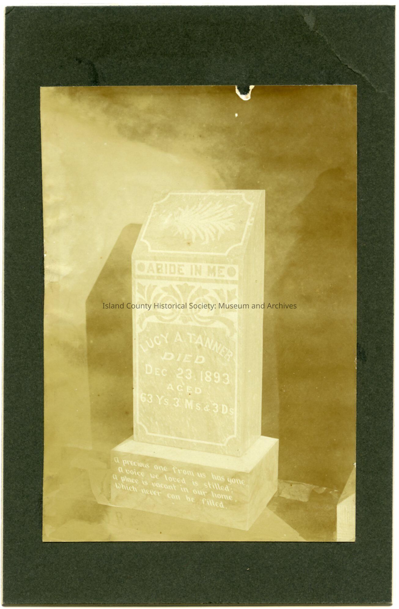 Photo of a gravestone for Lucy A. Tanner, died Dec 23, 1893, aged 63 yrs, 3 ms, & 3 ds.