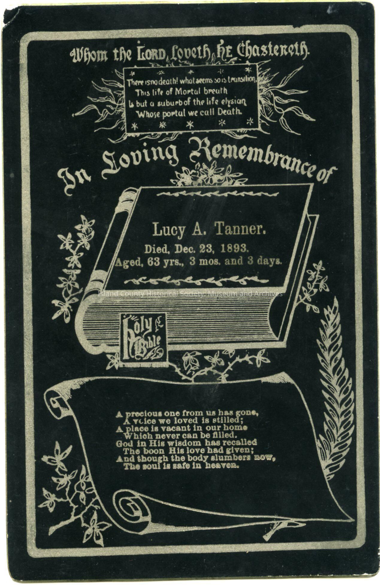 A remembrance card for Lucy A. Tanner, died Dec 23, 1893, aged 63 yrs, 3 mos, and 3 days.
