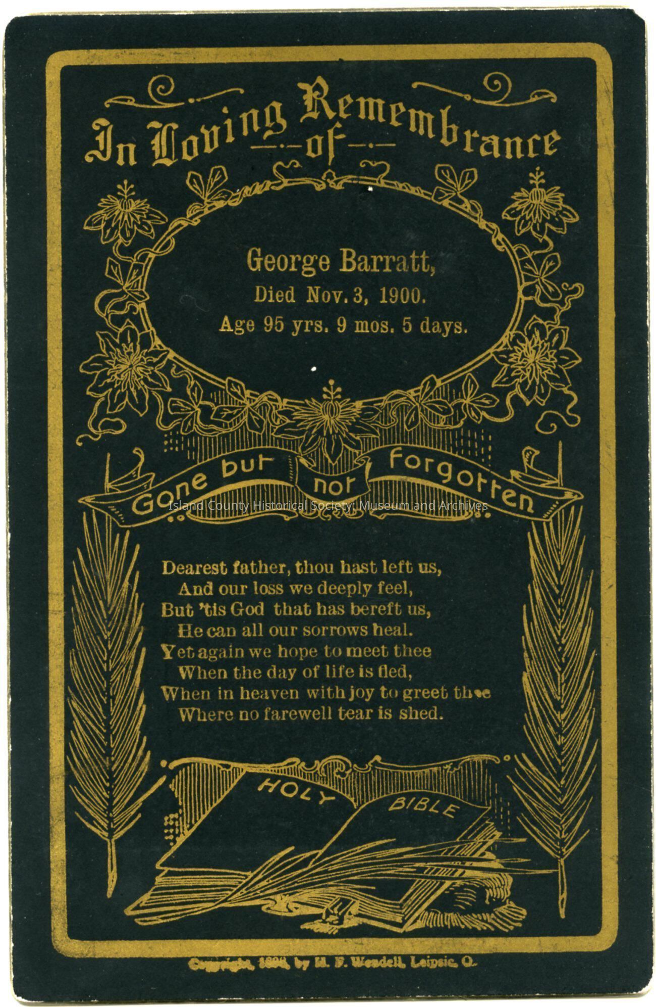 A remembrance card for George Barratt, died Nov 3, 1900, aged 95 yrs, 9 mos, 5 days.