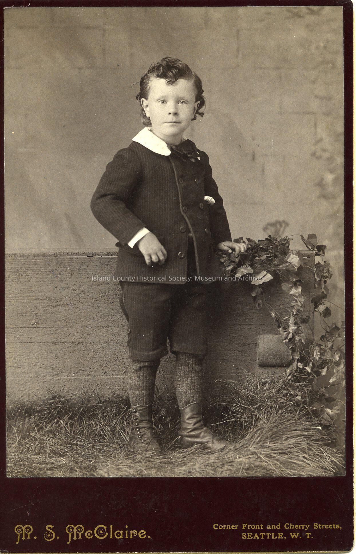 Black & white portrait photo of Charley Gillespie (son of John Gillespie) as a young 4 or 5 year old boy. It is mounted on cardstock with M. S. McClaire studio name in the bottom margin. Charlie is standing with his left hand bracing on a wall behind him. He is dressed in a white shirt with collar and bow tie, dark jacket, short pants, stockings and buttoned boots. He has curly dark hair. No date.
