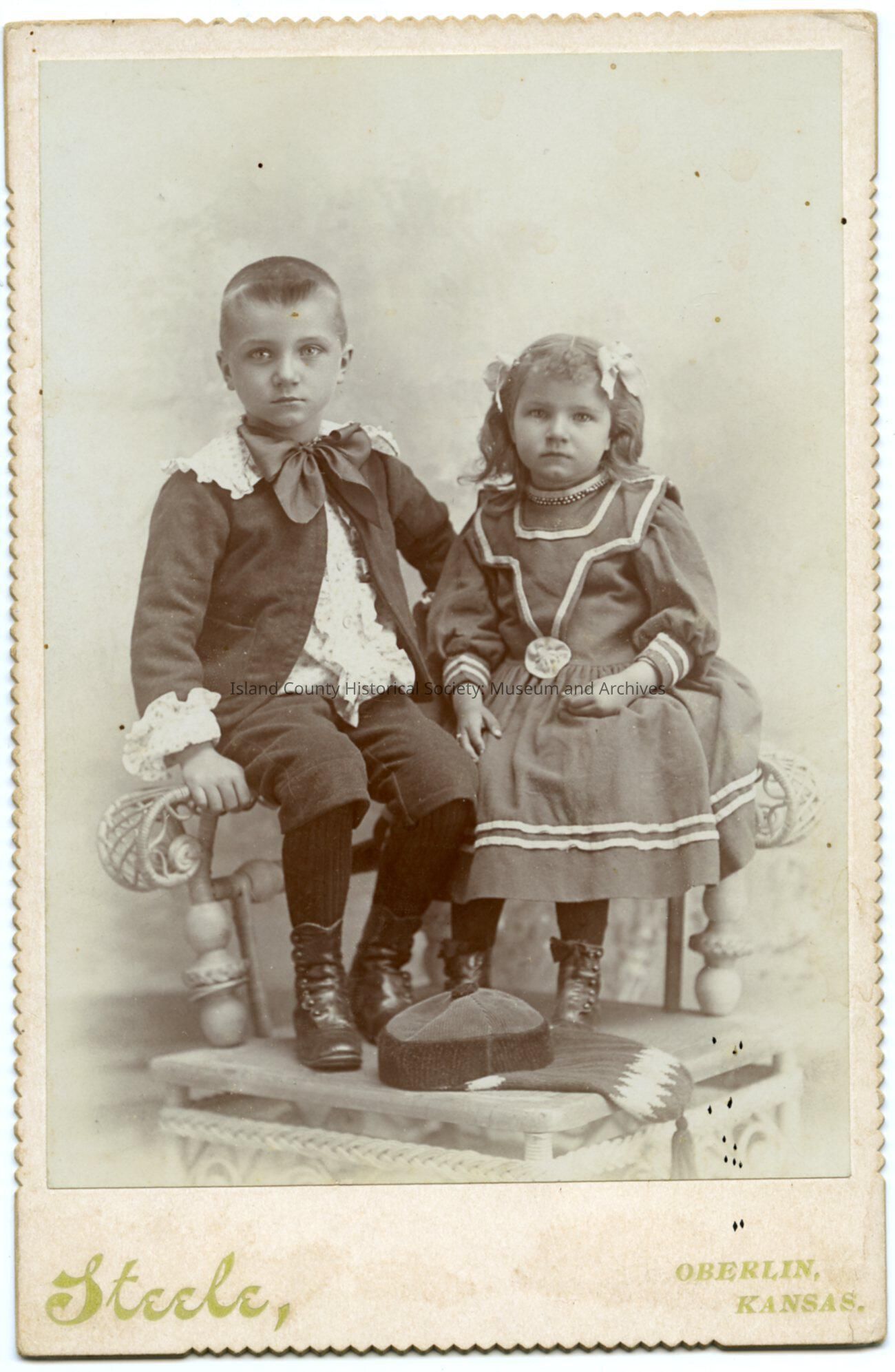Photo of a boy and girl seated on the back of a wicker chair. She is wearing a sailor-type dress, with bands around the skirt, cuffs, collar and bodice area; she has two bows in her hair. He is wearing a suit with knickers, lace cuffs and collar, wide bow at the collar. Both are wearing stockings and button-up high shoes. A hat and some other piece of material are on the seat. This chair is similar to the one in: 2019.012.056z and 2019.012.056ae.
