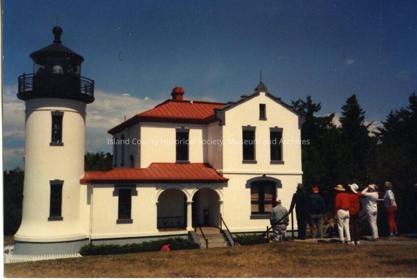 Admiralty Head Lighthouse Color photo showing the front view of the lighthouse. On the right a group of people are standing observing the lighthouse.
