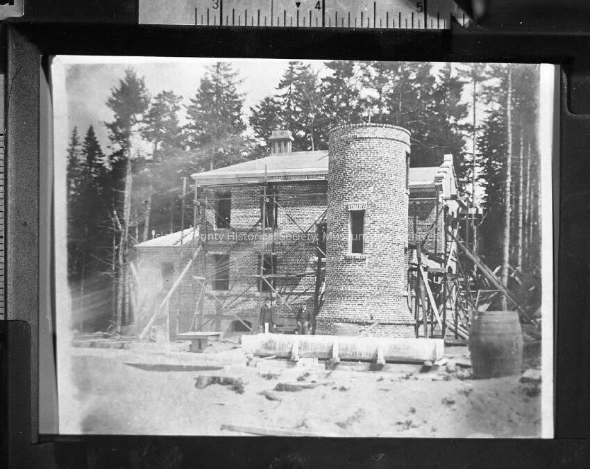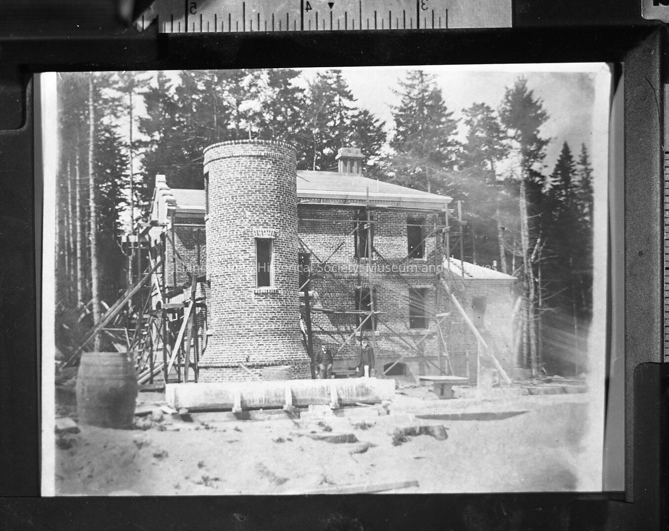 Negative shows the 1903 lighthouse under construction. Scaffolding surrounds the lighthouse building and the lighthouse tower is unfinished.Collection