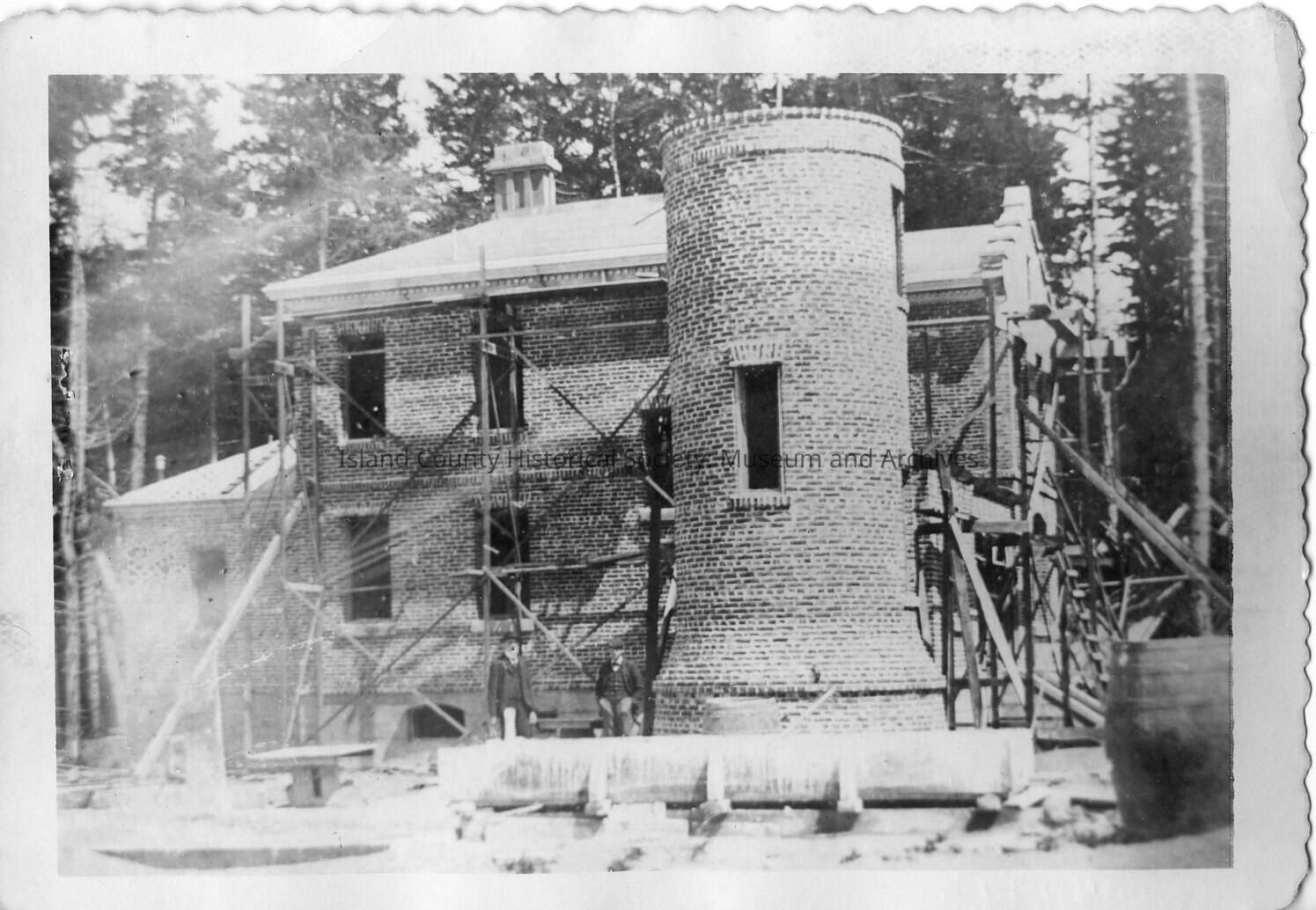 Black and White photo of the 1903 lighthouse being built. Scaffolding surrounds the building the lighthouse tower is unfinished.