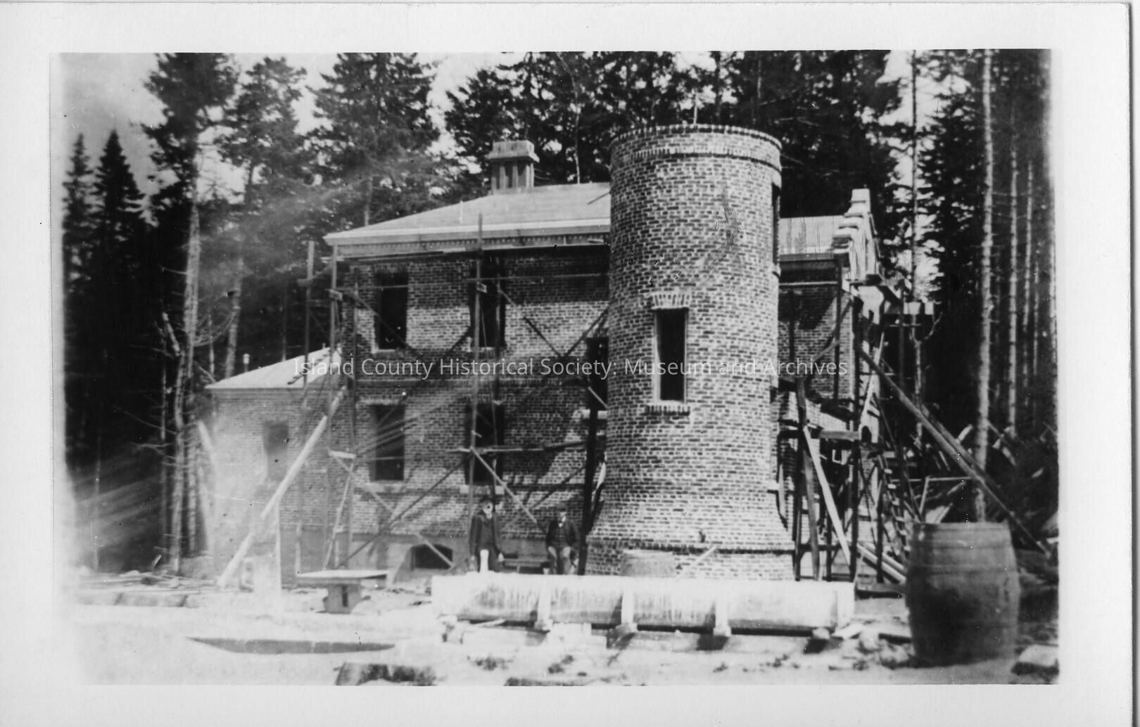 Black and White photo of unfinished 1903 lighthouse. The lighthouse column is not finished and the building is surrounded by scaffolding. Postcard printed by Kodak between 1950 and present. Back of photo reads: Building the Lighthouse at Ft. Casey.