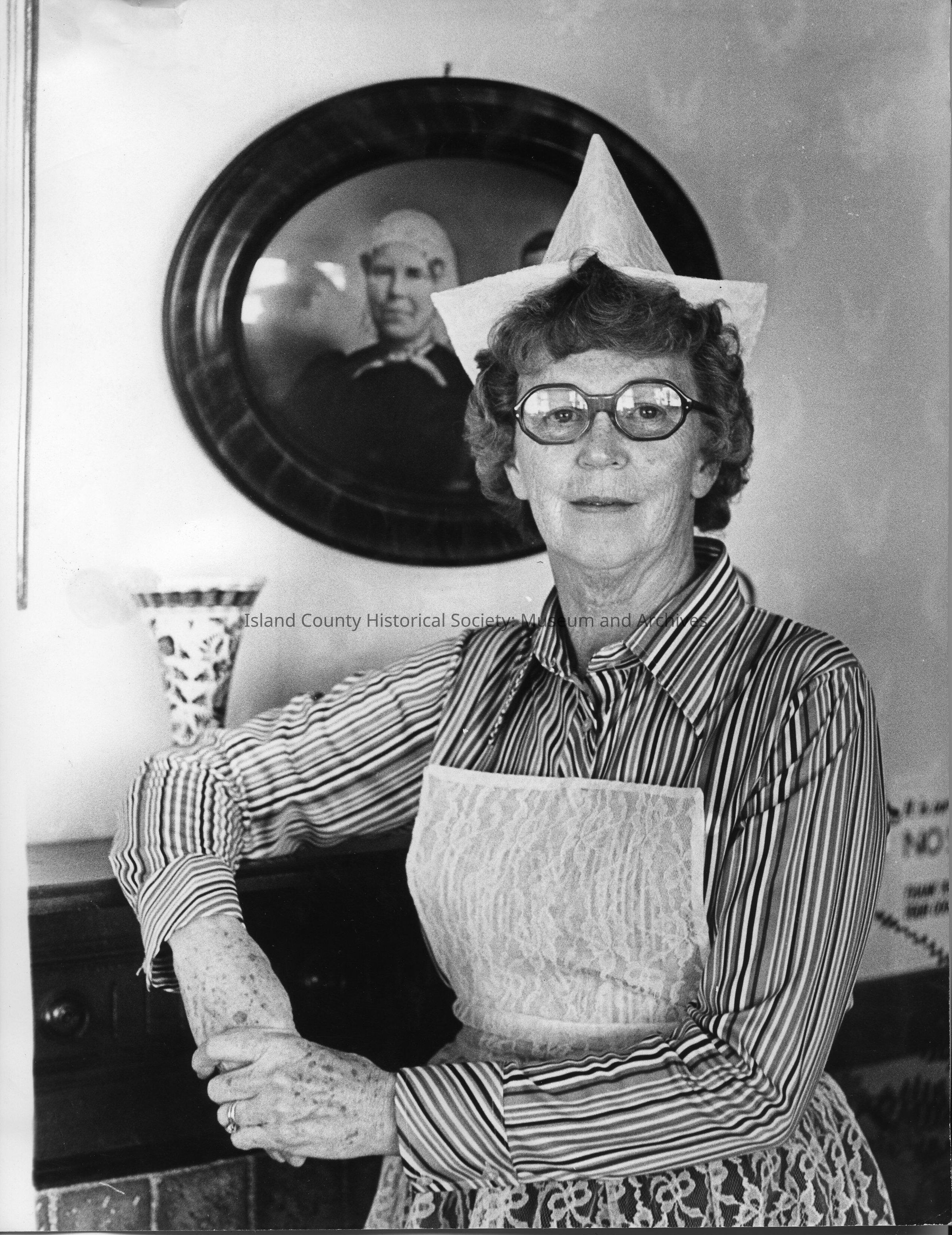 A black and white photo of a woman dressed in Dutch regalia. In the background of the photo is a picture of a man and woman hanging in a oval shaped frame. The lady in the photo has her armed propped on what appears to be a mantel with a vase.