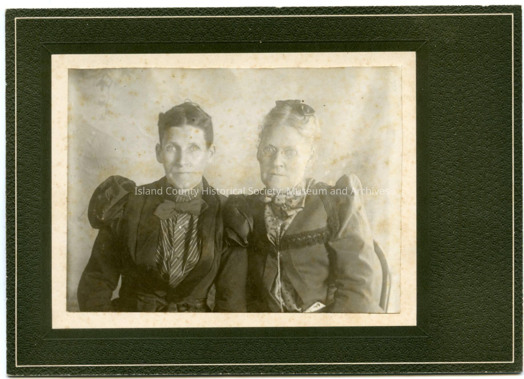 Photo of two women, either sisters or mother and daughter. They are wearing dresses or jackets with sleeves puffed at the shoulders, bows at the collar, and their hair is pulled up and back; the woman on the right has a bow in her hair and is wearing spectacles/glasses. The photo is longwise and offset on the cardboard frame. Written on the back: Emma Morris; her sister
