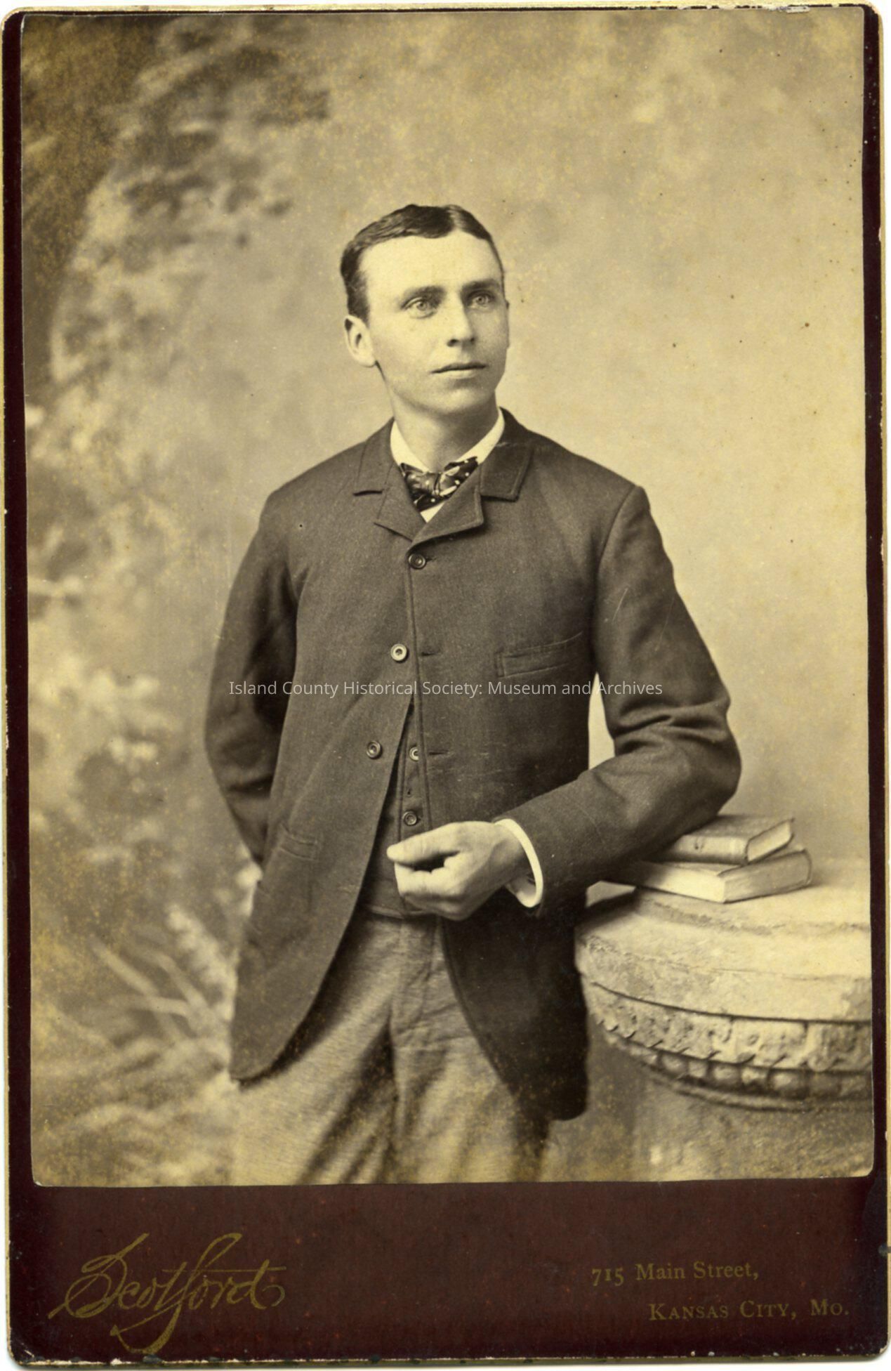 Photo of a man standing with his left arm leaning on two books on a prop pedastal. His right arm is behind his back. He is wearing a suit with a spotted bow tie.