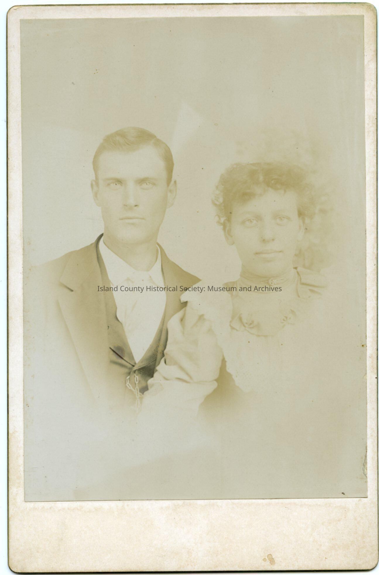 Photo of a man and a woman (on his left) from mid-arm upwards. He is wearing a suit and is slightly behind the woman. His is clean shaven and his hair is parted on his left side. She is wearing a dress/top with ruffles on the shoulders and neck, with a high collar.