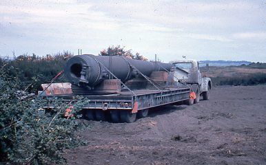Photograph of an artillery weapon on a flatbed truck, ready for transportation.