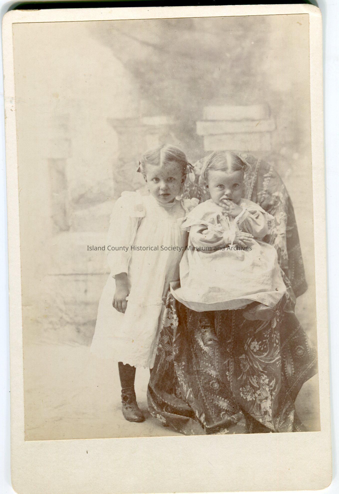 Photo of two girls. The older is standing on the right side of a chair, upon which the younger is seated. The older is wearing a knee-length dress, stockings and high-top shoes and has bwos in her hair. The younger is wearing a dress, high-top shoes and has her the first two fingers of her left hand in her mouth.