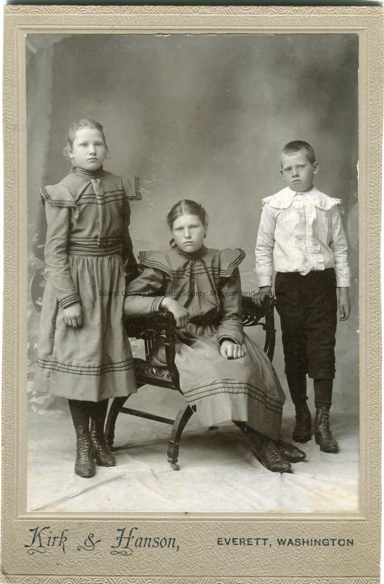 Photo of two girls and a boy. One girl is standing to the right of the chair, upon which the other girl is seated. The boy is standing to the left of the chair. The girls are wearing identical dresses, bands around the hem, cuffs, bodice, waist, neck and shoulder flaps. They are wearing stockings and high-top shoes. The boy is wearing a ruffled collar shirt, knickers, and high-top shoes.