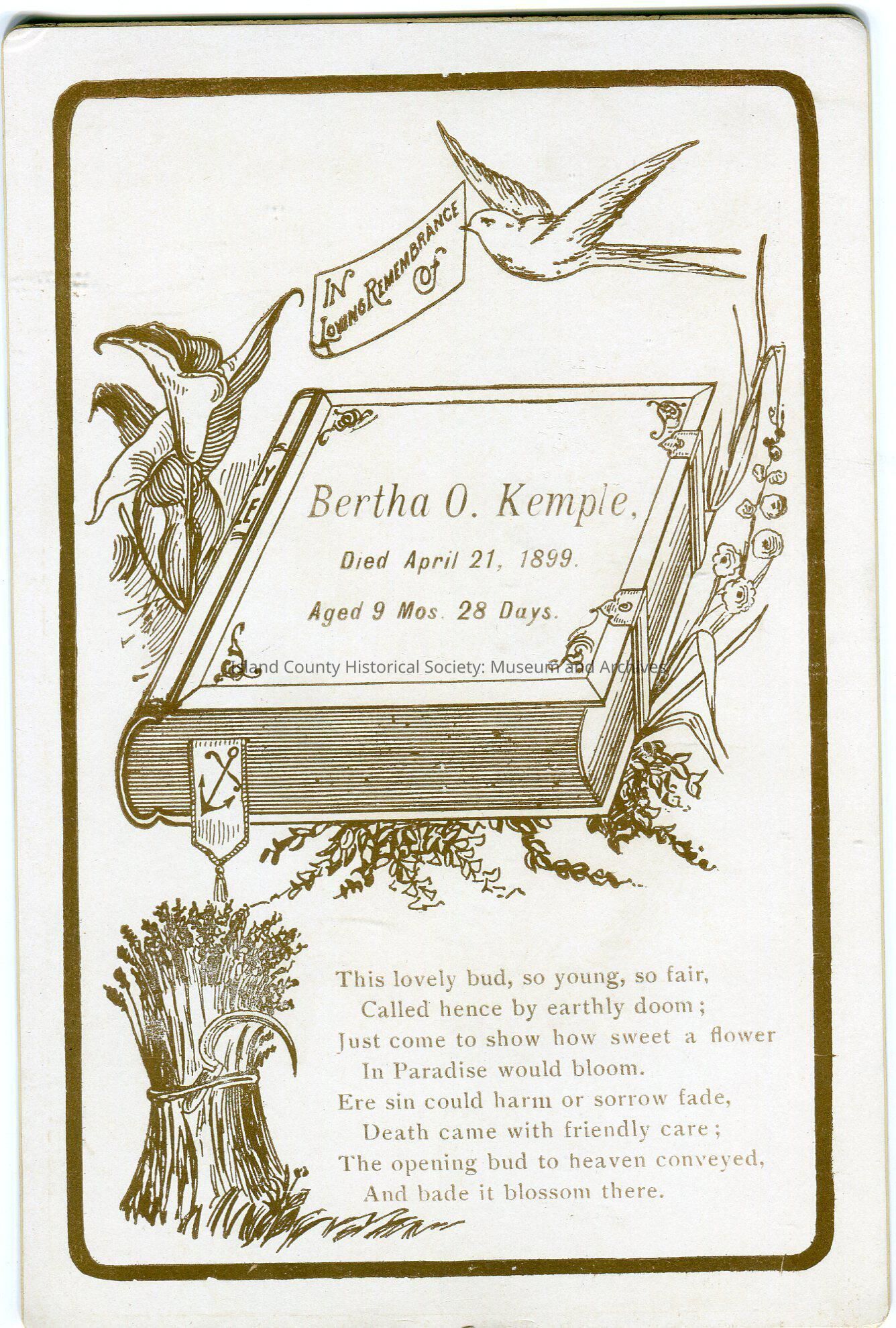 Photo of a remembrance card: Bertha O. Kemple, died April 21, 1899, aged 9 mos, 28 days.