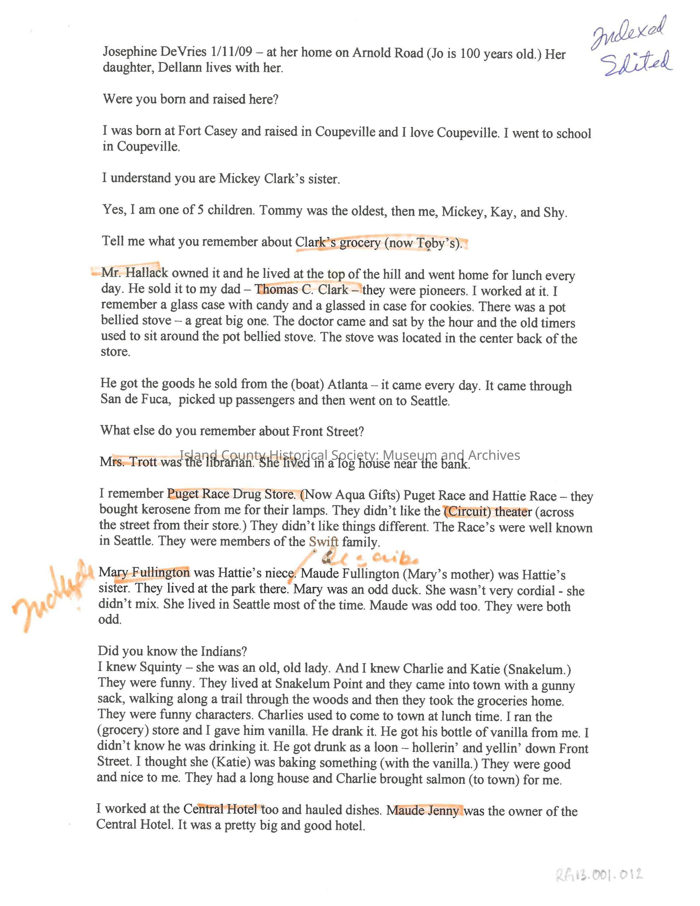 Interview with Josephine DeVries, 11 January 2009, at her home on Arnold Road, by Judy Lynn.Collection