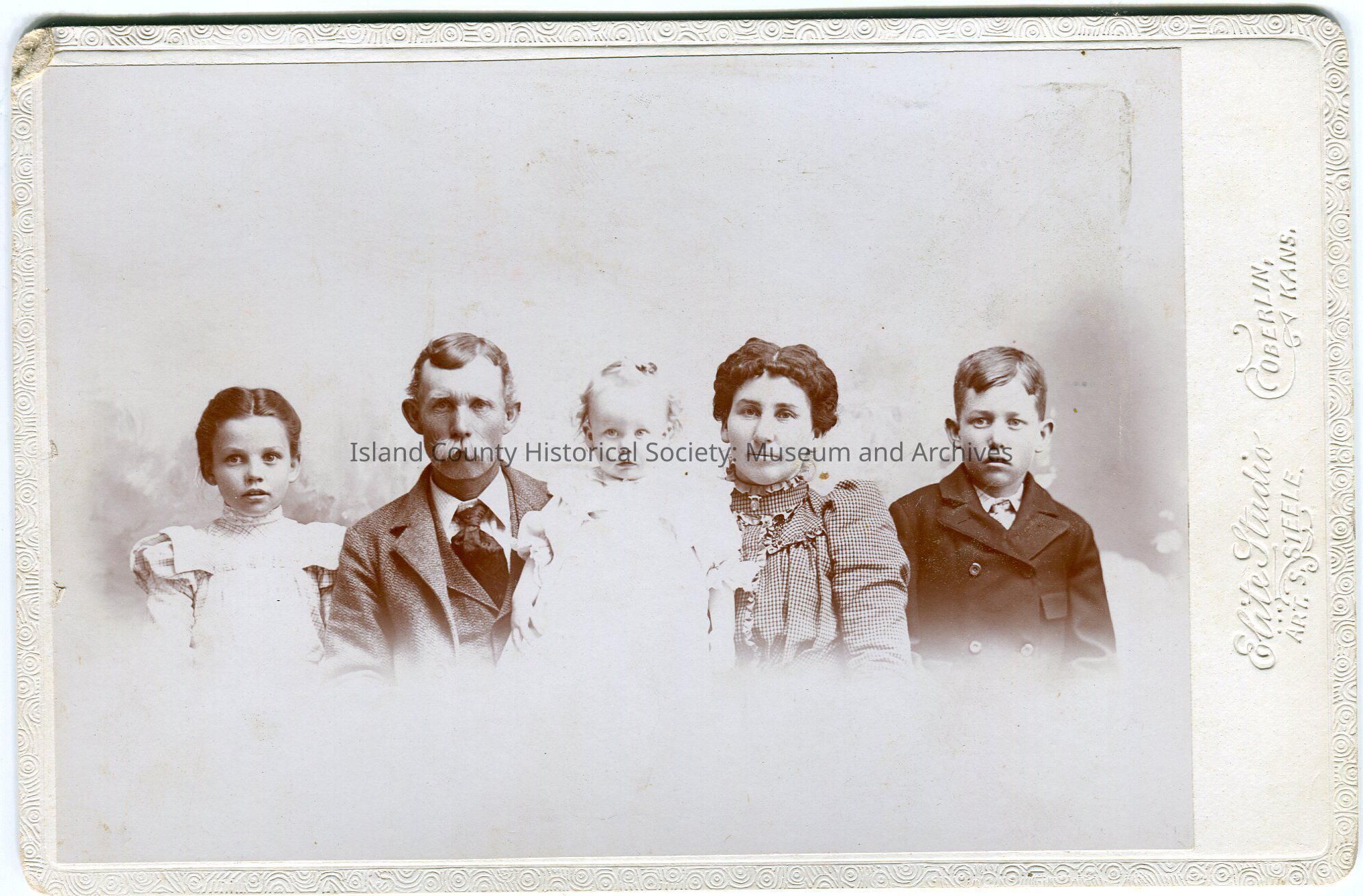 Photo of a family from left to right: a girl wearing a dress with puffed shoulders and high collar; man with mustache wearing a suit and tie; baby wearing a gown; woman weraing a checked and ruffled/pleated dress with a high collar; boy wearing a suit and tie. The photo is lengthwise and slightly offset to the left.