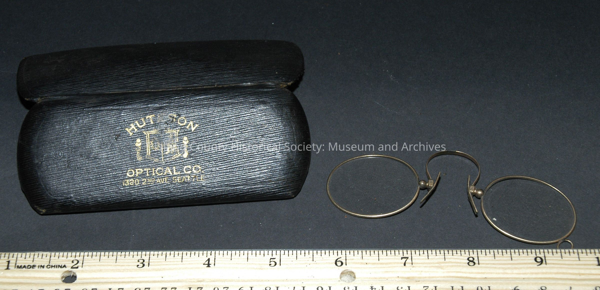 Rimless glasses, "Miss O. Benson", "Mrs. J.S. Tufts". Plus the case.