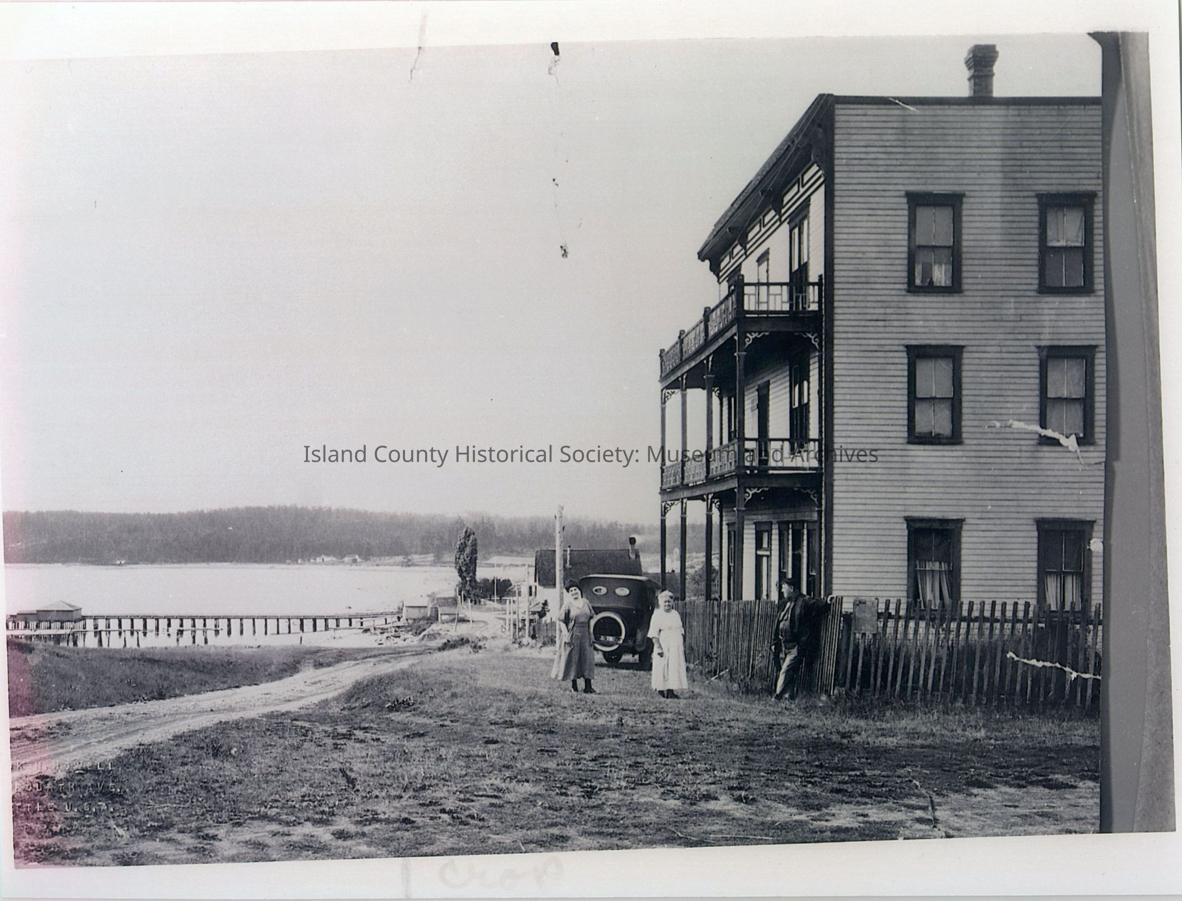 Photograph of the San de Fuca hotel and wharf, c. 1900. The remains of the Armstrong wharf are visible in the foreground, just in front of the standing wharf.
