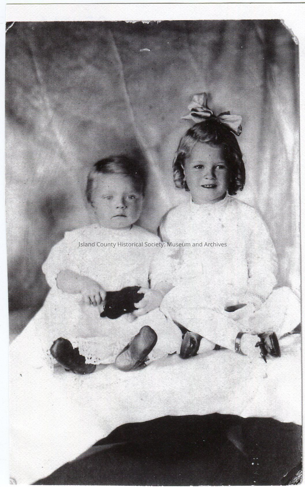 Photo of two girls seated in a draped chair. They are wearing dresses, shoes and the older girl has bows in her hair. The younger girl on the left is holding a something in her hands. Written on the back: Dorothy and Wilma Morris, 1917