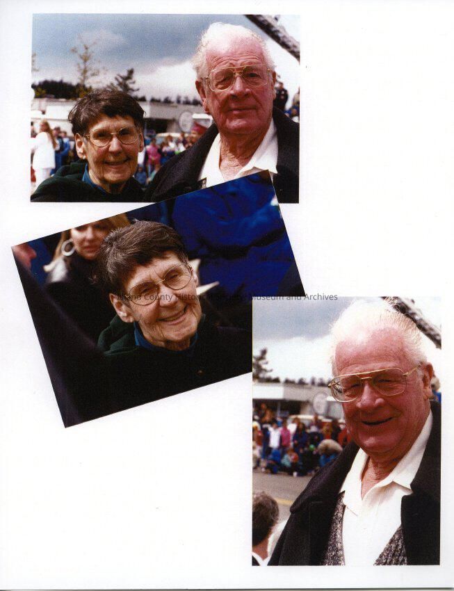 Members of the Freund family. Back of photo reads: Top: Betty, Arnie Freund Middle: Betty Freund Bottom: Arnie Freund @ homecoming from plane crew downed in China Collage of three photos printed on one sheet of photo paper.