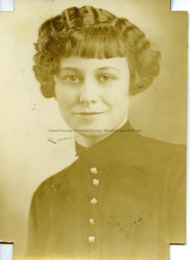 Portrait of Maxine Fowler. Her hair is short and curled, she is wearing a dark shirt with square buttons.