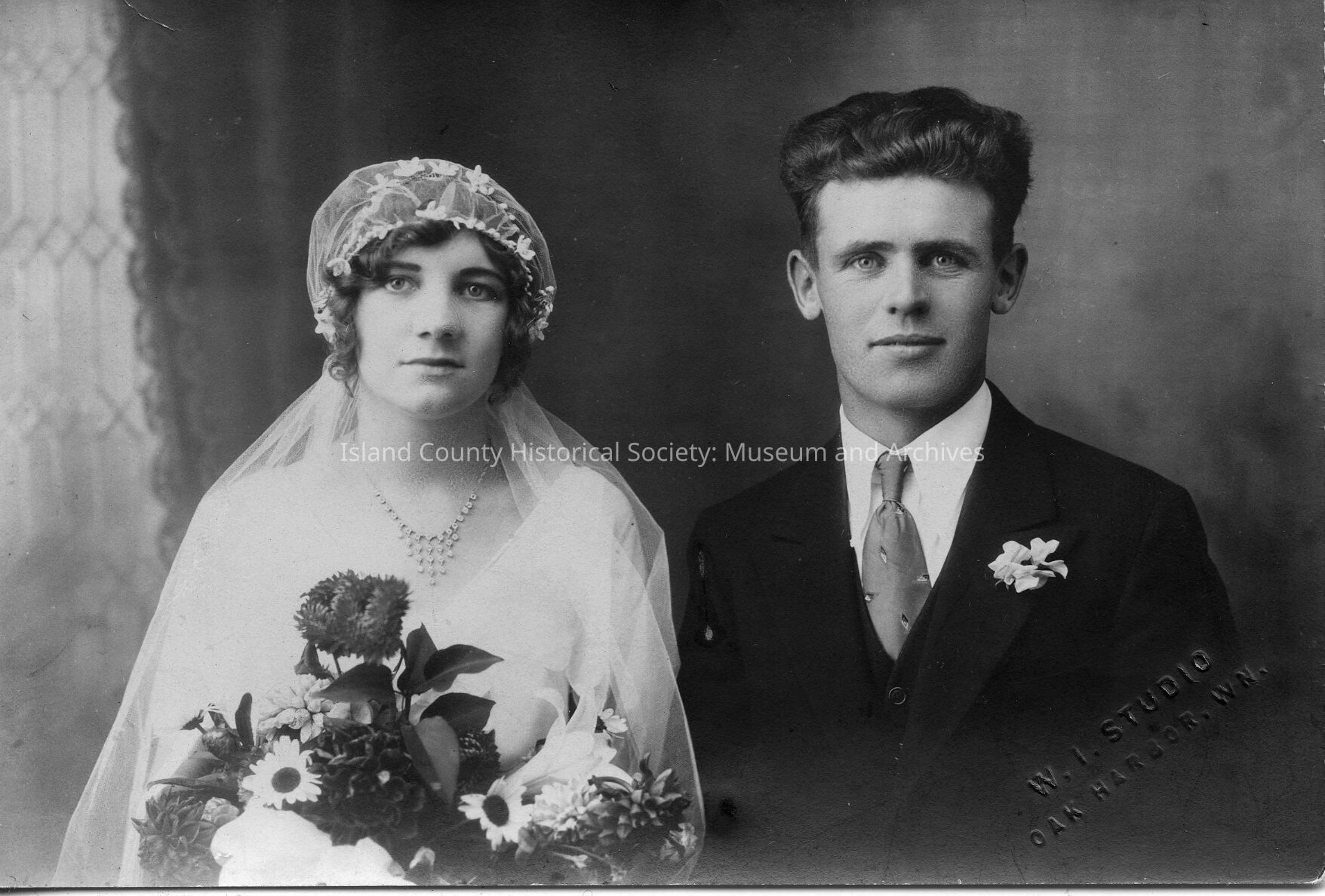 Black and white photo of a man and a woman. Handwritten on the back is "Bert & Janet Rientjes wedding." The woman is holding a bouquet of flowers and is wearing a lace bonnet type of veil. In the back of the picture you can see one curtain panel on the window.
