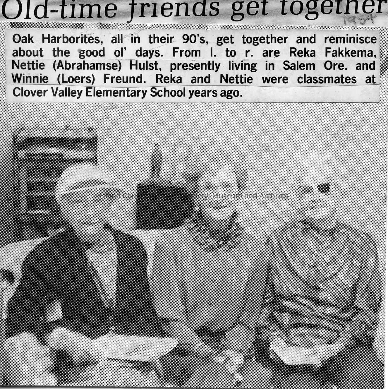 From L to R are Reka Fakkema, Nettie (Abrahamse) Hulst, presently living in Salem Ore. and Winnie (Loers) Freund. Reka and Nettie were classmates at Clover Valley Elementary School years ago.Made/Created
