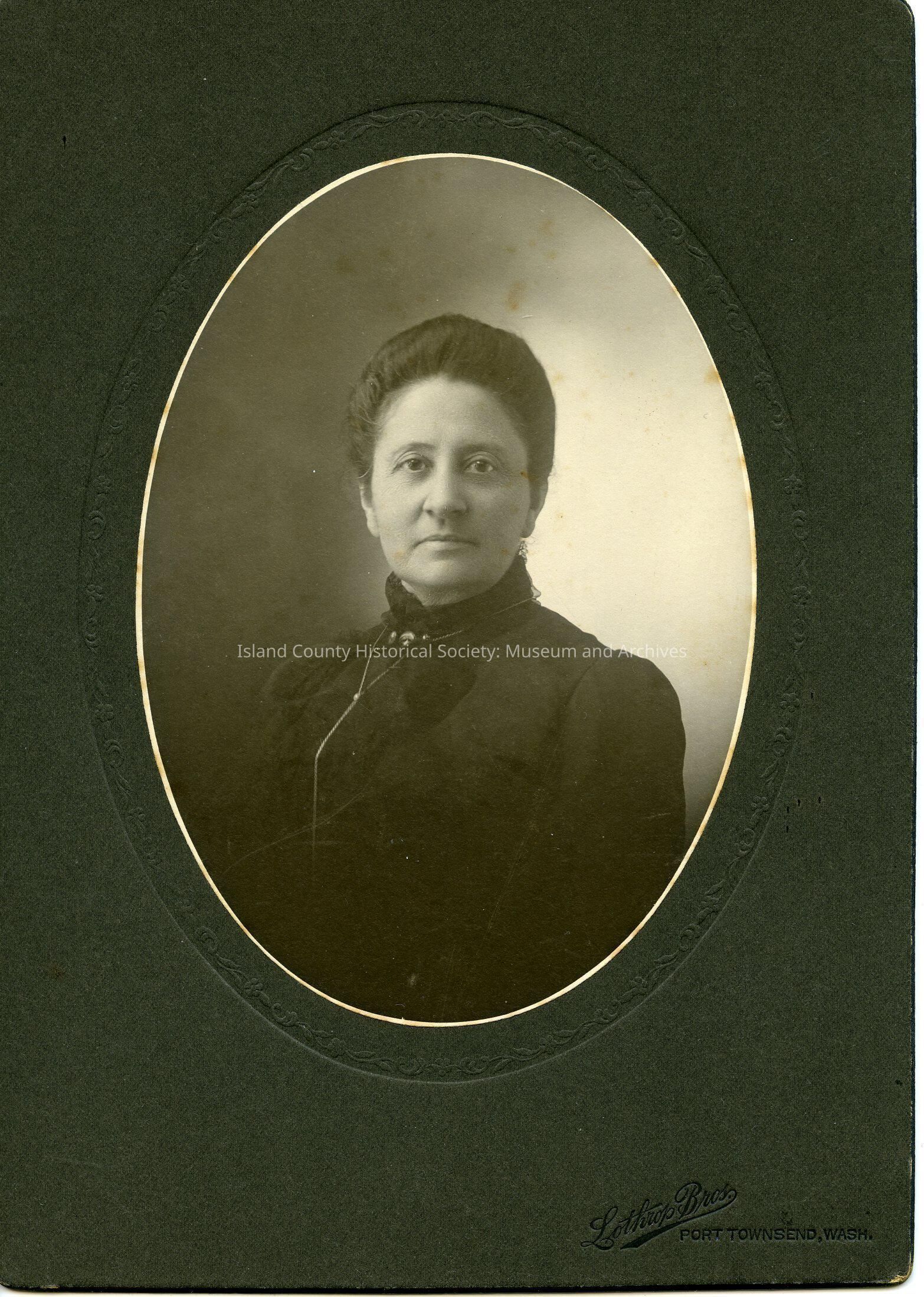 Portrait of Mrs J.E. Evans. Evans was the wife of the fourth lighthouse keeper at admiralty head. "Mrs. Evans, whose husband was at the lighthouse - Casey" Page 117 and 120 in "A Particular Friend - Penn's Cove" (by Jimmie Jean Cook) P96-616-P