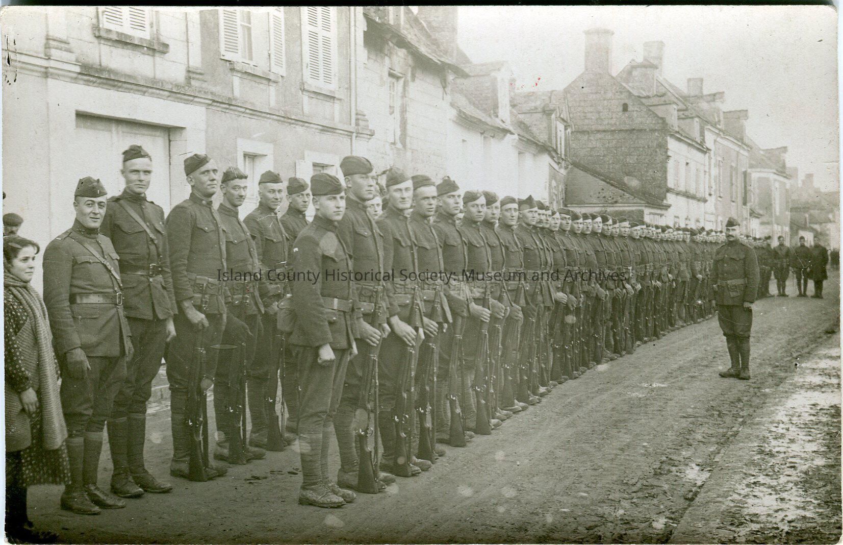 Postcard of troops in two rows, probably in France during World War I. About 80 men and officers. A few townspeople are on the far left. Buildings with chimneys line the dirt road. THe men are armed, parade rest.