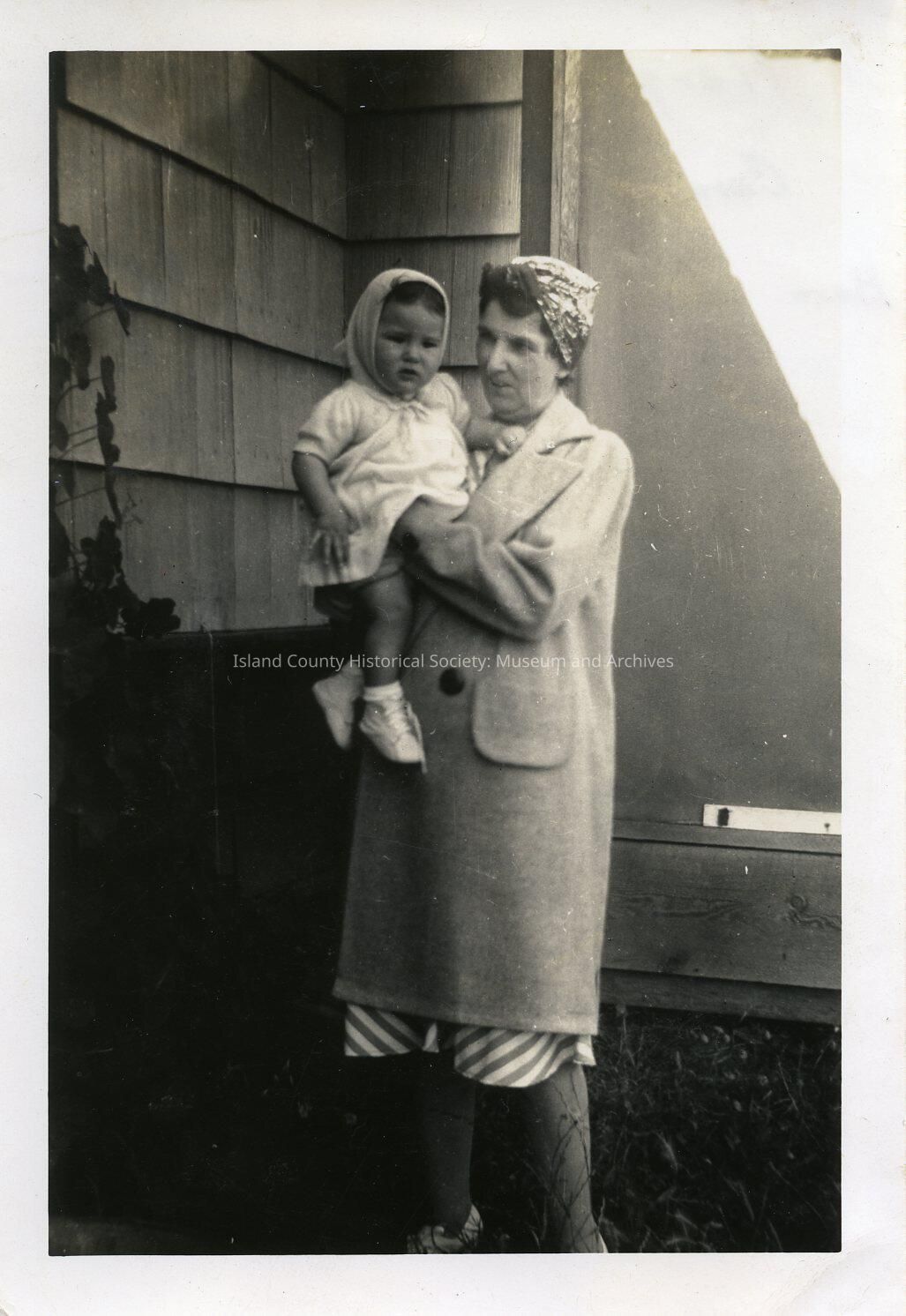 A woman in a striped dress with a coat and turban/bandana holding a little girl in a dress with a cap. On the back: A Harpole baby Carolyn Joyce Argent Born Nov. 27, 1944 age 8 mos. and Grandma WIllard. Part of the Polly Harpole exhibit.