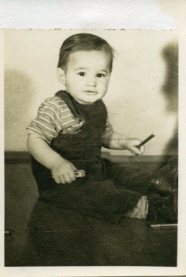 A young boy in a striped shirt and overalls holding toys. On the back: 1942 Daniel Ivan Cardwell Part of the Polly Harpole exhibit.