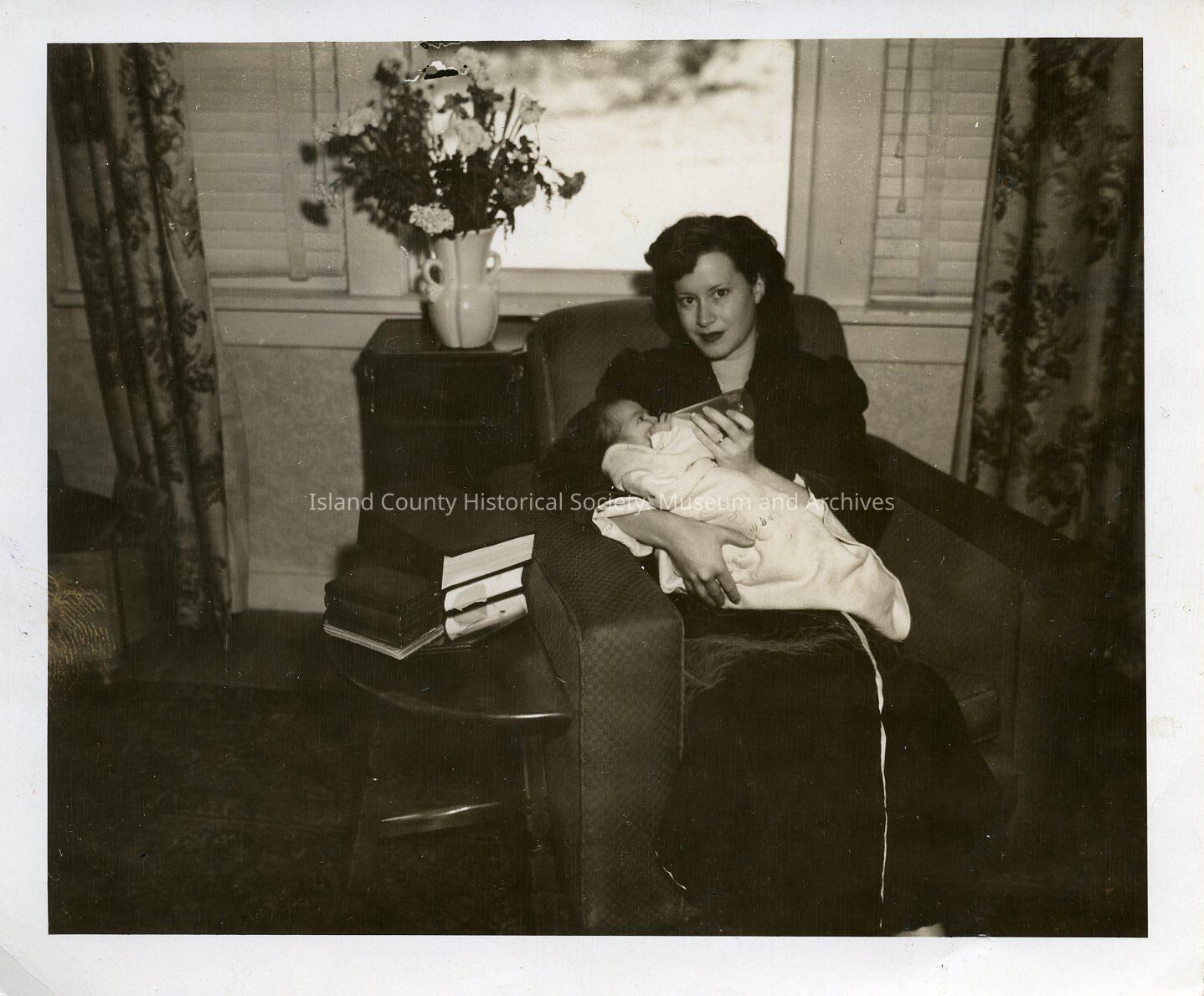 A woman seated in a chair holding a baby and feeding her or him a bottle. There is a vase of flowers behind her and books on the low table beside the chair. On the back: ? Part of the Polly Harpole exhibit.