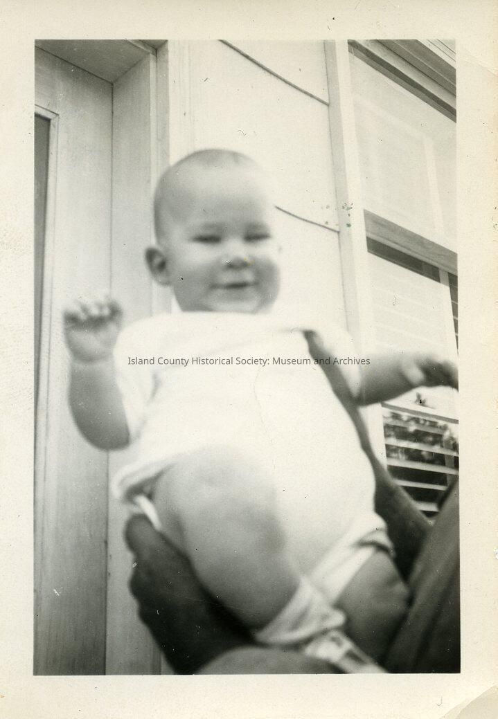 A baby boy in onesie being held by someone who is just out of the photo. The photo is outside. Part of the Polly Harpole exhibit. On the back: Jerry Lee Auvil at 5 months born Feb. 25, 1946 He has two teeth already!