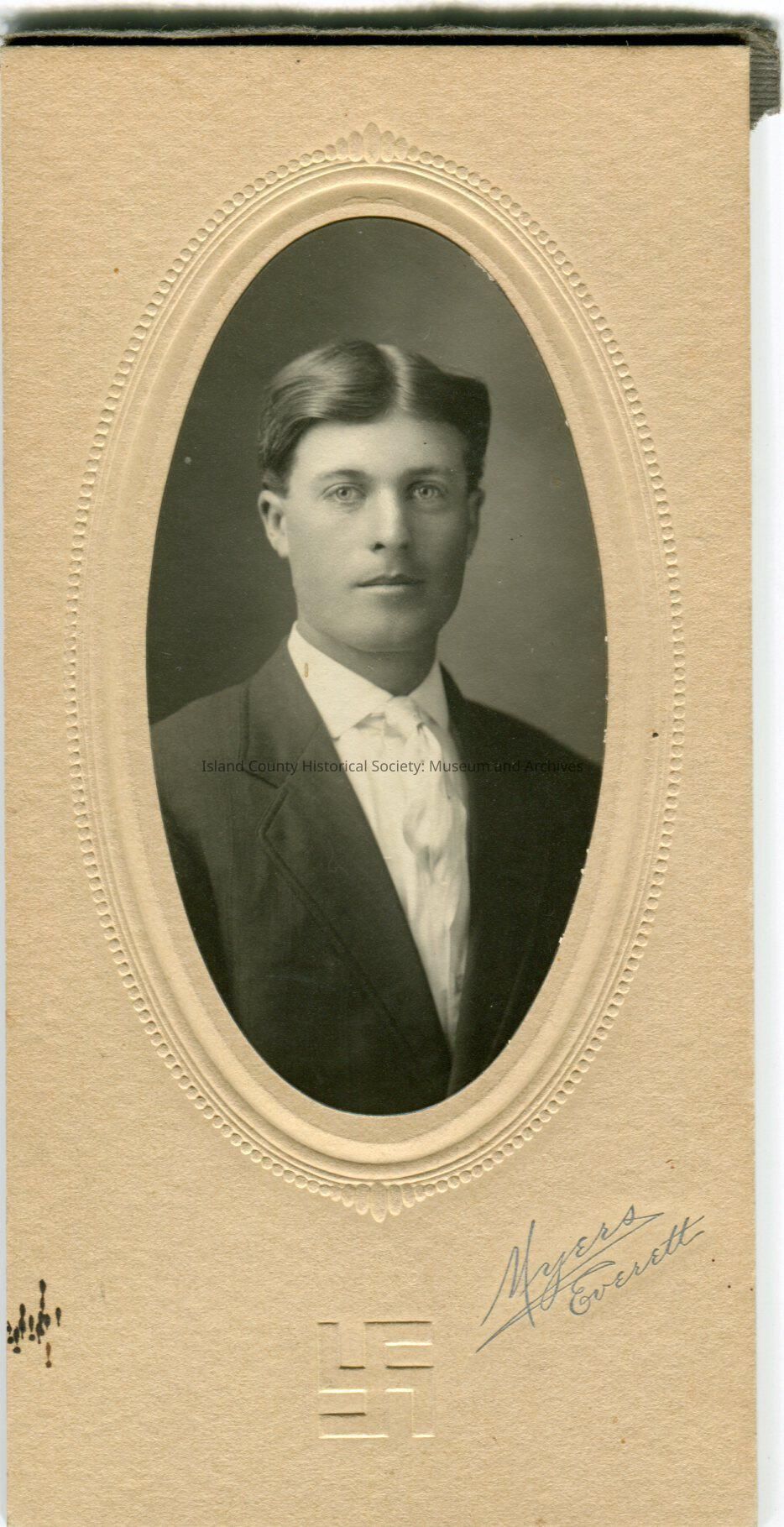 Photo of a man in a suit - oval photo in a cardboard frame. His hair is parted down the middle.