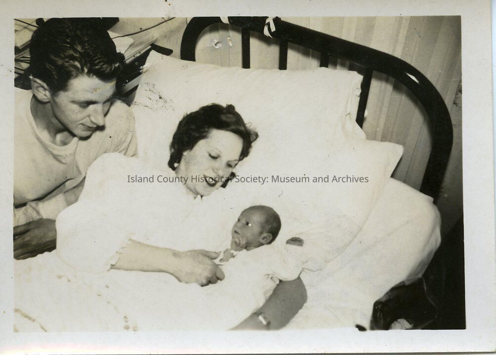 A baby beside a woman in a hospital bed with a man beside them. Part of the Polly Harpole exhibit. On the back: Bonnie Lou Morris (could be Billie - not sure of the letters) Walter Patmore The photo has a stamp on the back - 1948.
