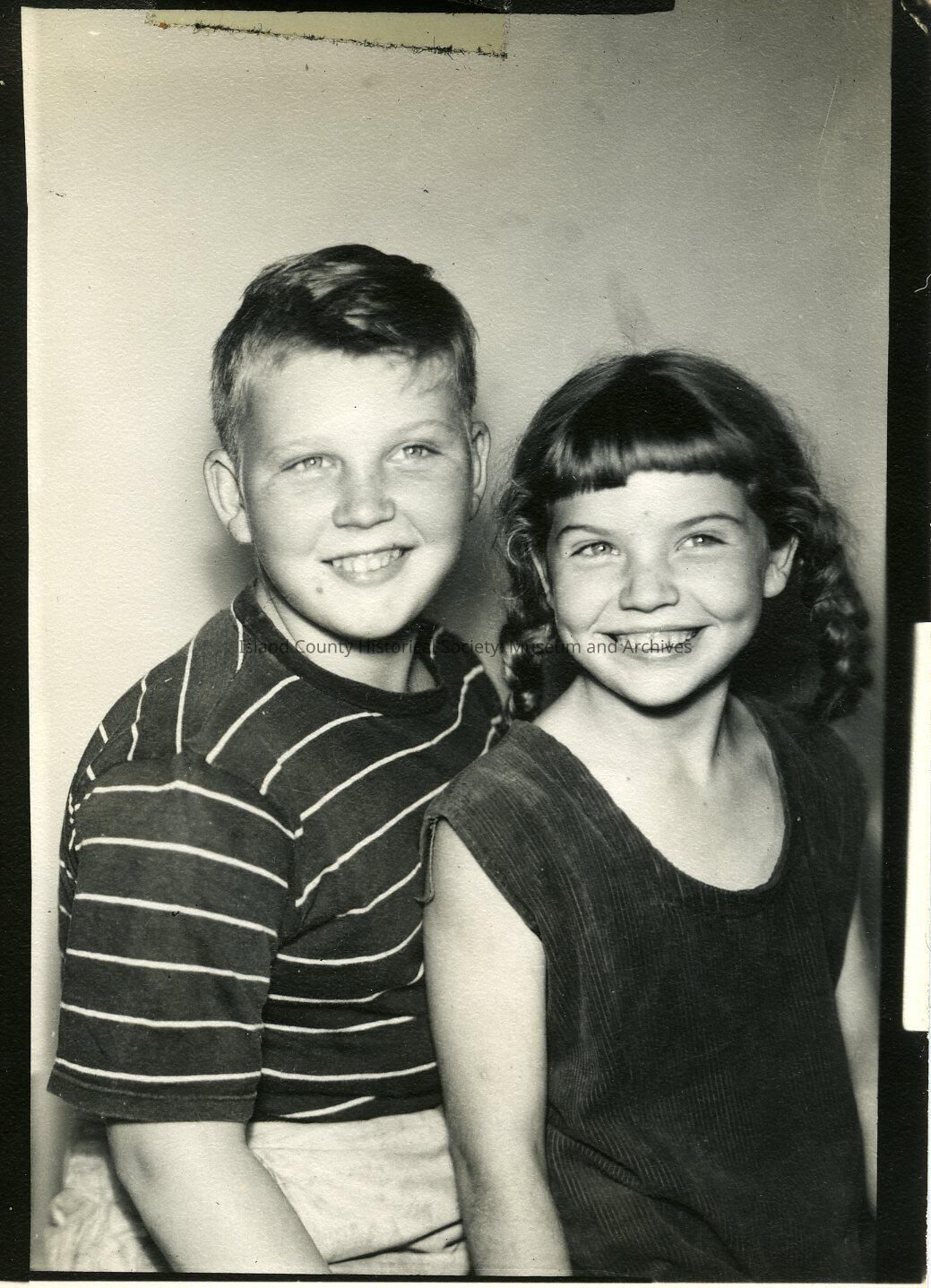 A boy and girl seated and smiling. He is wearing a striped shirt, she has a sleeveless top. Part of the Polly Harpole exhibit. On the back: Al & Lulu Bowers
