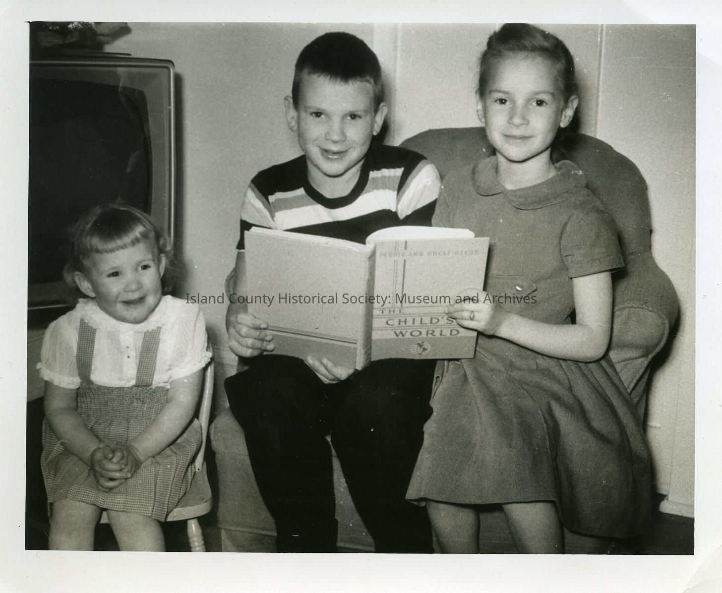 Three children - a little girl seated on a child's chair beside an older boy and girl seated together on chair. They are holding a book "Child's World".