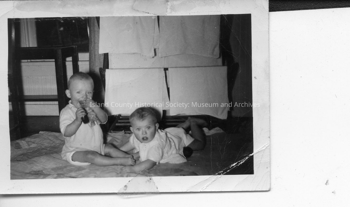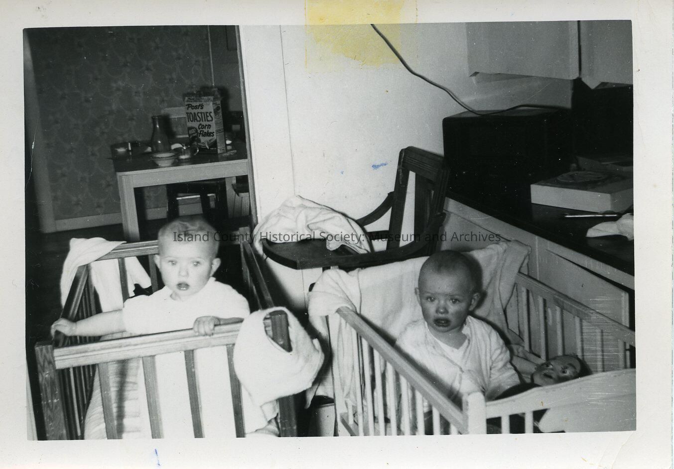 Two babies in their own cribs - beside each other. The one on the right does not look happy. There is a highchair behind them and a table with breakfast set out.