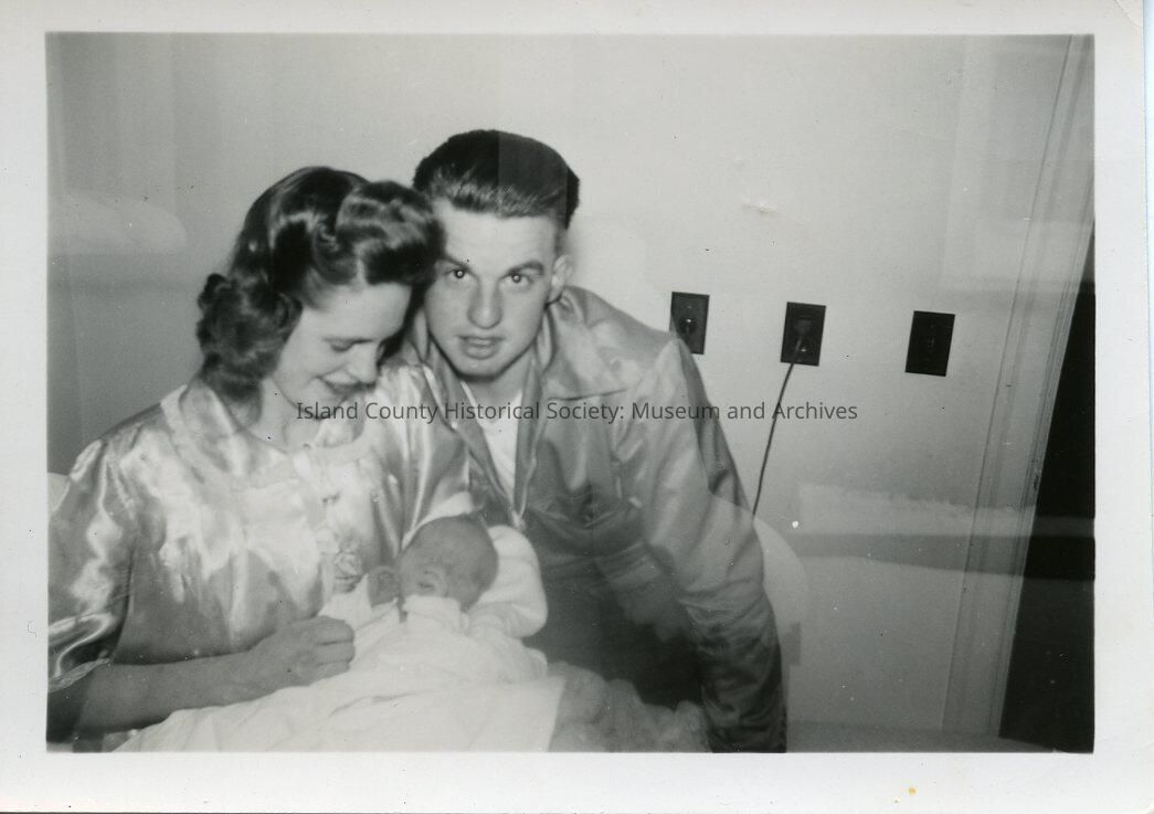 A young man and woman holding a baby. Part of the Polly Harpole exhibit. On the back: ? Stamped: Mar 22 1949 Jacobson's Bellingham, Wash.