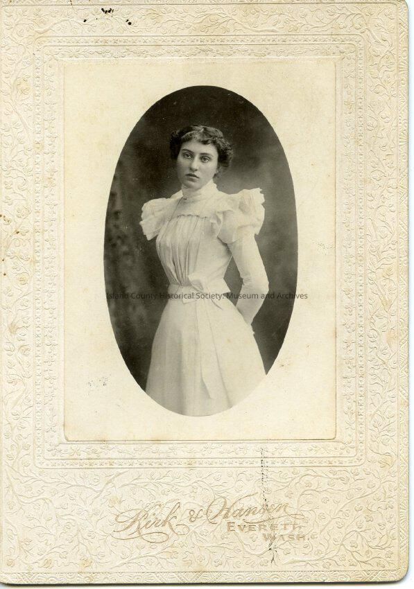 Portrait photo of Ernestine Engle at 17-18 years old, back of photo reads: born 1881. Photo is on a cardboard frame.