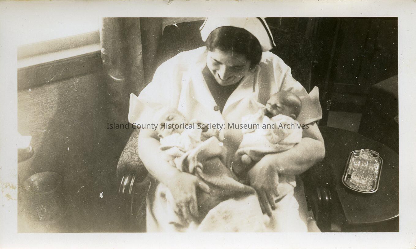 Mrs. Harpole in her nurse's uniform and cap holding two babies. Part of the Polly Harpole exhibit. On the back: Muzzall 1939 Tom & Jerry
