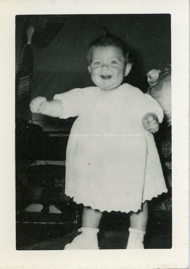 A little girl in a dress, walking. Part of the Polly Harpole exhibit. On the back: Nancee Lee Zylstra age 9 months