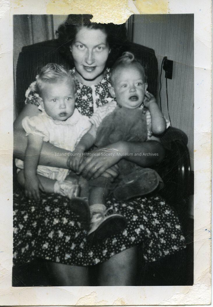 A woman seated in a chair holding a little girl and boy. She is wearing a printed dress. Part of the Polly Harpole exhibit. On the back: 1 year Fossek 1947 Kathleen & Henry