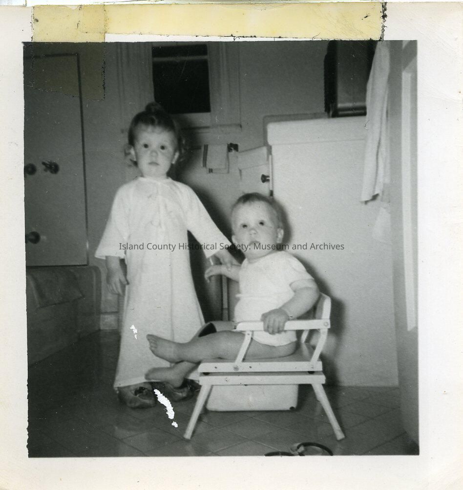 A little girl and boy. She is wearing probably a nightgown. He is seated on a potty. Part of the Polly Harpole exhibit. On the back: Lorrie and John Turpit 21 mos. and 8 mons. Taken May, 1947