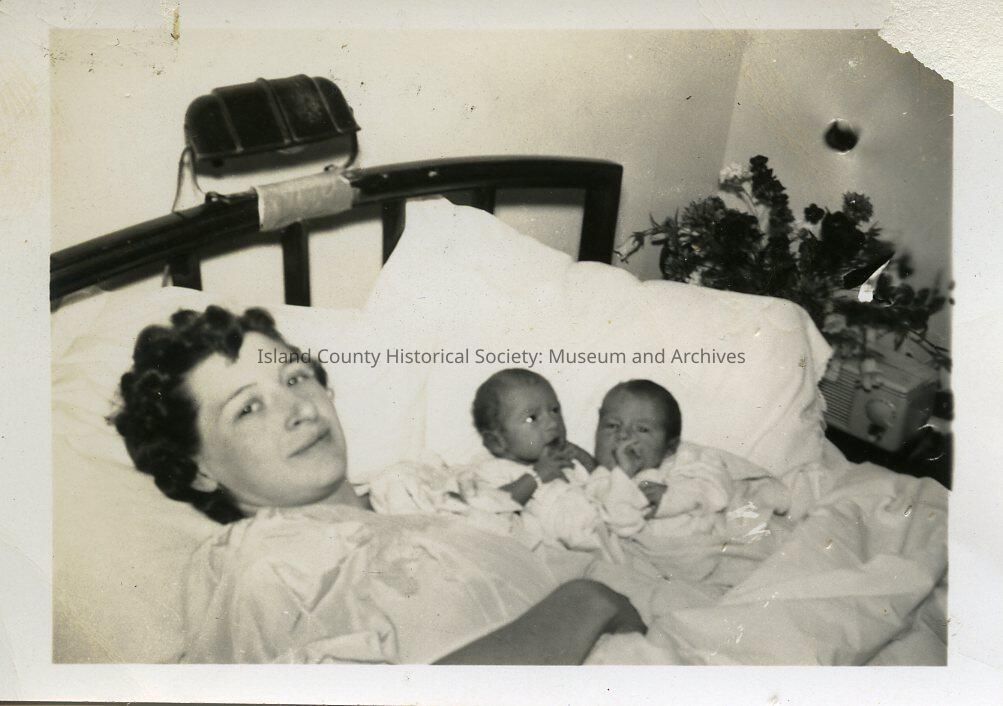 A woman (mother) and her two babies lying in a hospital bed. Part of the Polly Harpole exhibit. On the back: Jorja & Berta Quade 1948