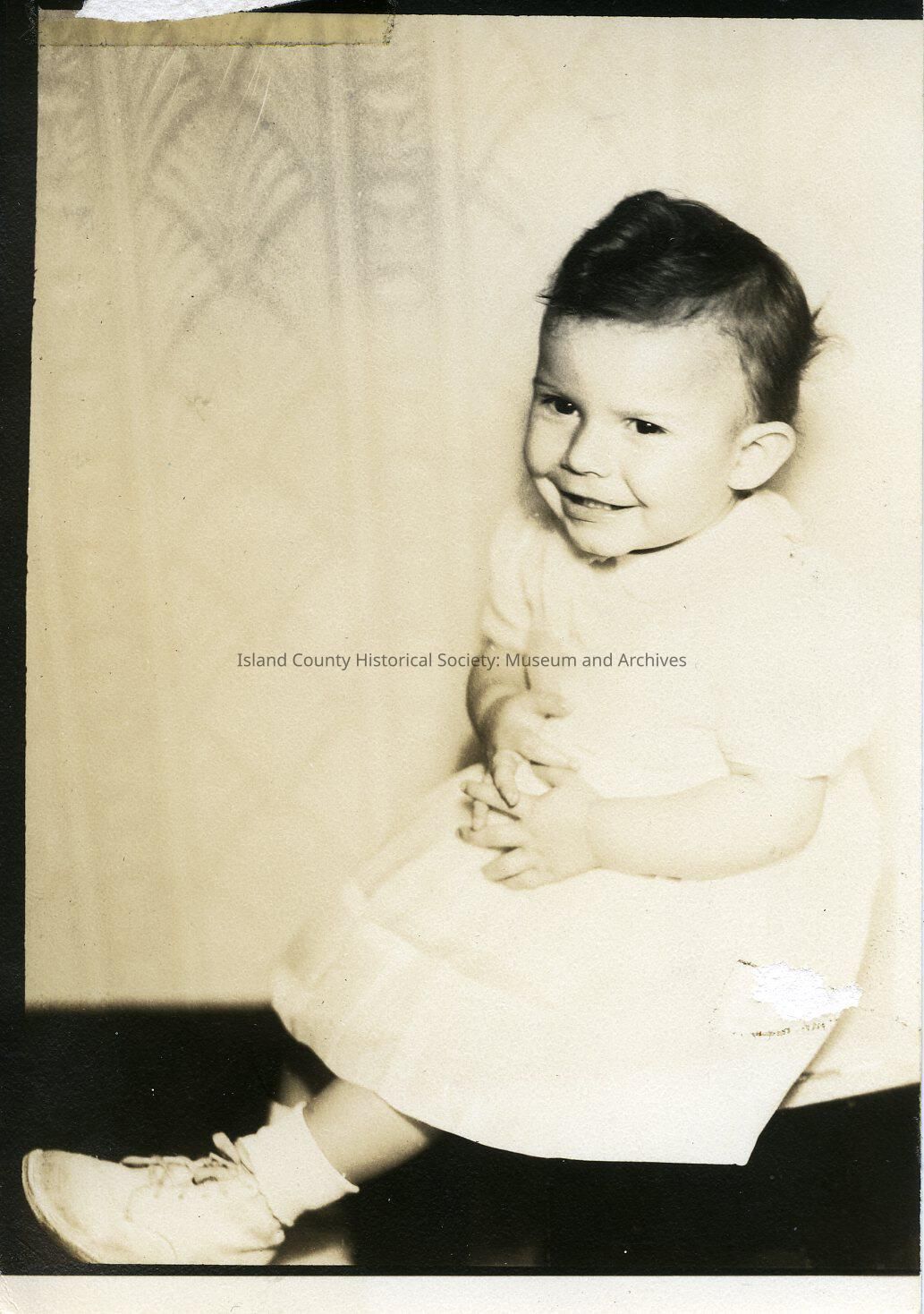 A little girl in a dress. Part of the Polly Harpole exhibit. On the back: Judith Ann Bainbridge Age 19 months Aug 1946