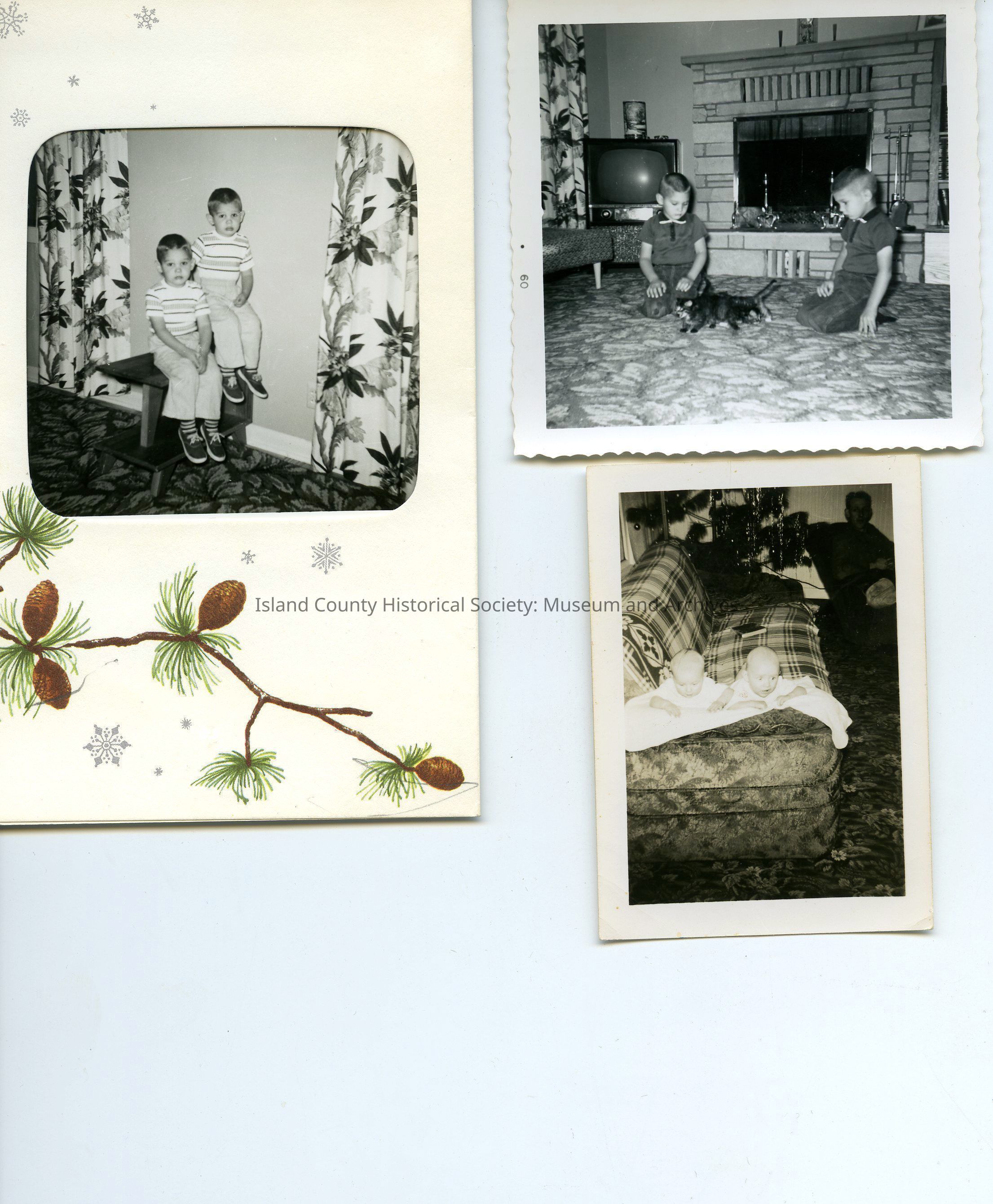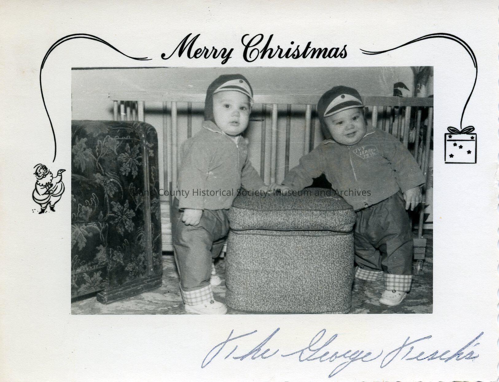 A Christmas picture card with two boys on each side of a hassock with a playpen behind them. they are in identical outfits. Part of the Polly Harpole exhibit. On the front: The George Tesch's On the back: Tesch