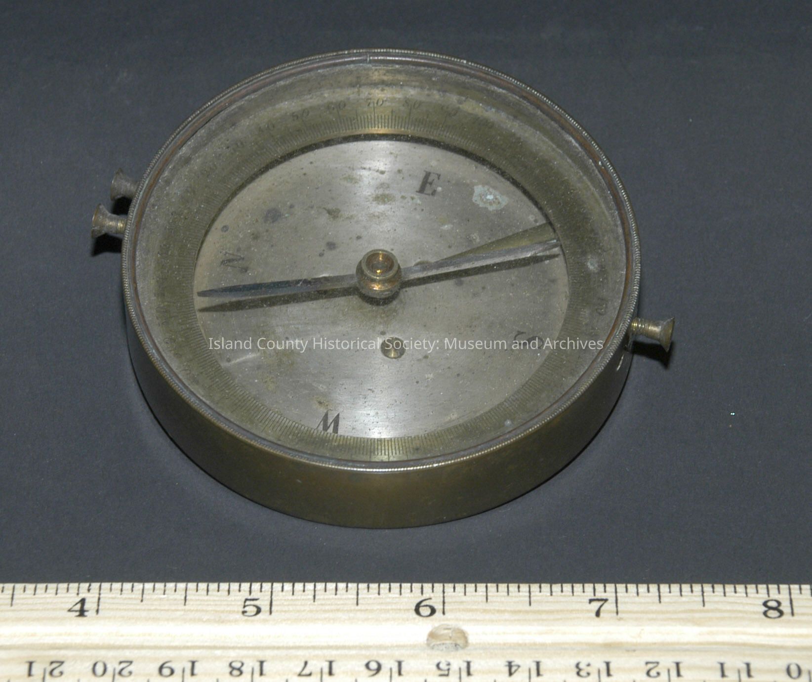 Brass compass, appears to be part of survey instrument.