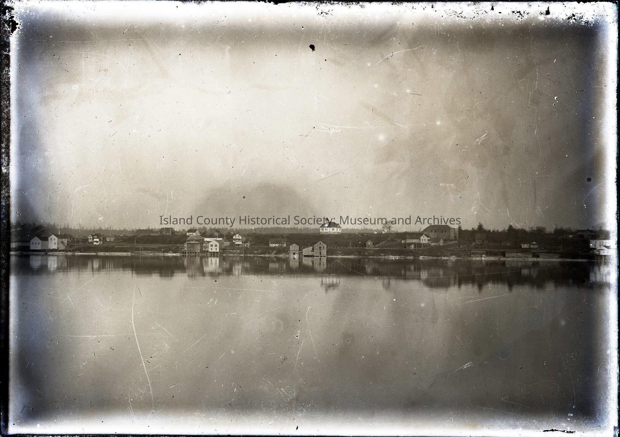 View of the coast of Oak Harbor - houses, buildings, a school on the hill.
