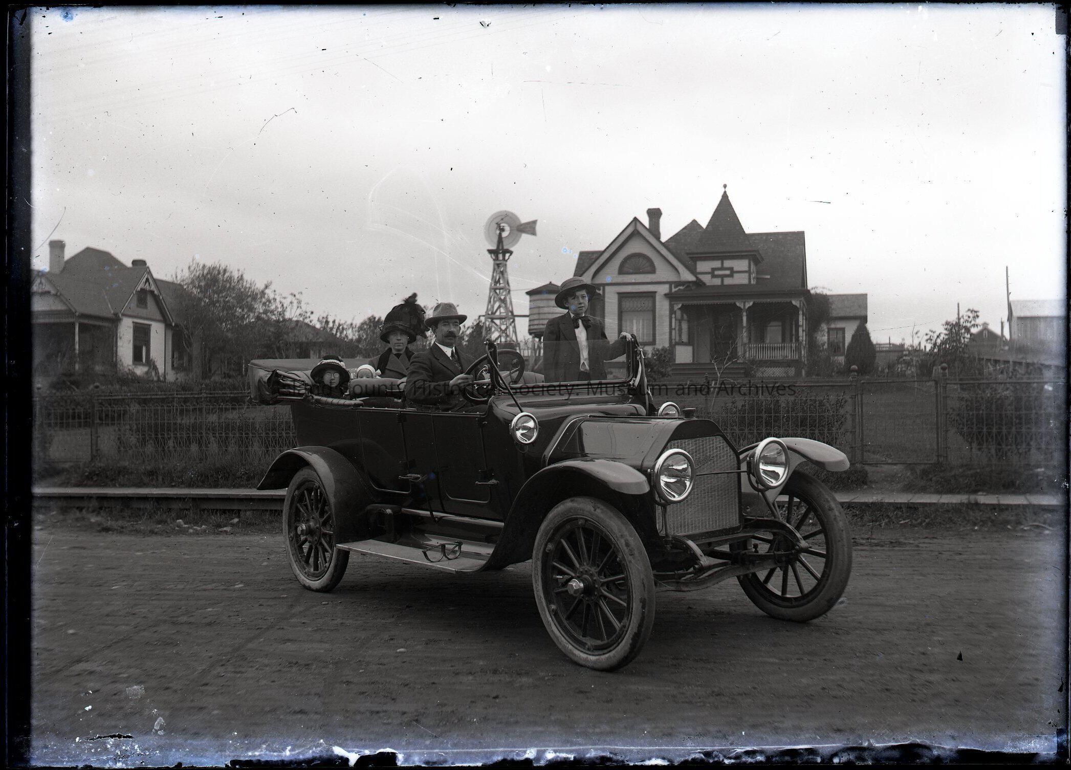 Family in their car. Man in driver's seat. Boy standing in front of the passenger seat. Woman and a girl and probably toddler in the back seat. Houses in the background. Windmill or watermill.