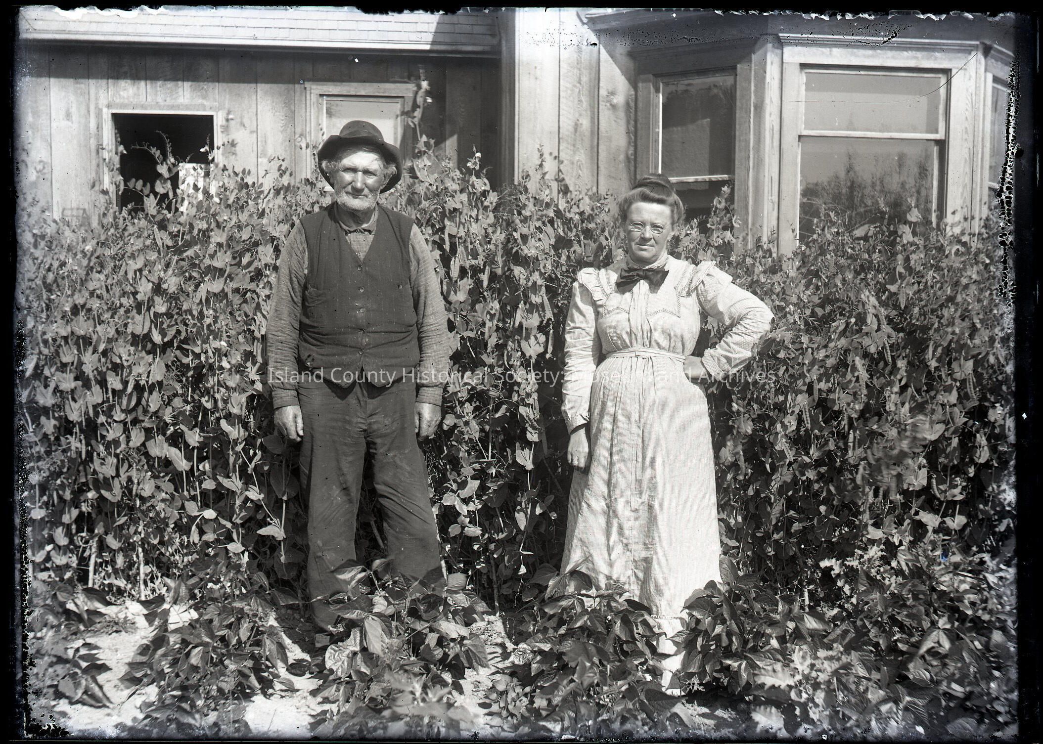 Older man and woman standing in the garden in front of a wood house. Bay window. She is wearing a dress with a bow tie at her neck. He is wearing shirt, trousers, vest and a hat.